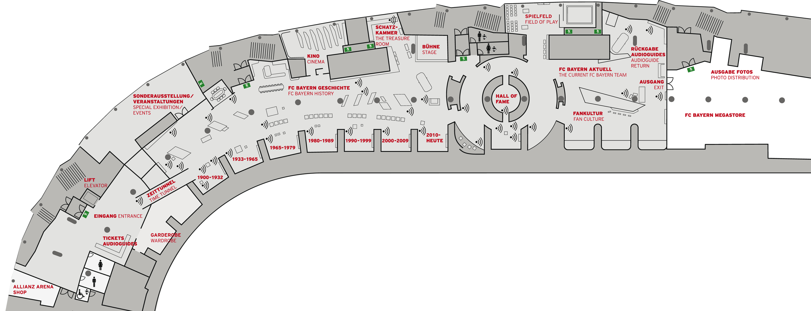 In sieben Zeiträumen wird von der Gründung bis heute alles über den FCB erzählt. Auch gibt es viele Sonderthemen zum FC Bayern.