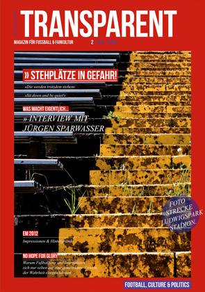 Transparent Nr. 2 - August 2012 Fotostrecke: Ludwigspark Stadion Saarbrücken, EM in Polen und der Ukraine Titelthema: Stehplätze in Gefahr (Die werden trotzdem stehen, Sit down and be quiet, Der Gipfel und die Fackel) Interviews: Jacek Purski (Organisation Never Again) Weitere Themen: No hope for glory - Fußballfans vs. Medienvertreter Fußball, Frauen, Gleichberechtigung: Don' t believe the Hype - Der ausbleibende Boom im Frauenfußball Fans & Verbände: Zuviel "Respect" vor der UEFA Marke Ein Blick über die Landesgrenzen hinaus: Ultras in Ägypten Was macht eigentlich? Jürgen Sparwasser (ehem. 1. FC Magdeburg) Kultur: Bandportrait Stage Bottles aus Frankfurt Sonstiges: Kurioses, Unterwegs in..., Leseprobe, Bücherrezessionen, verbrochenes.net, Ein Tag im Museum |